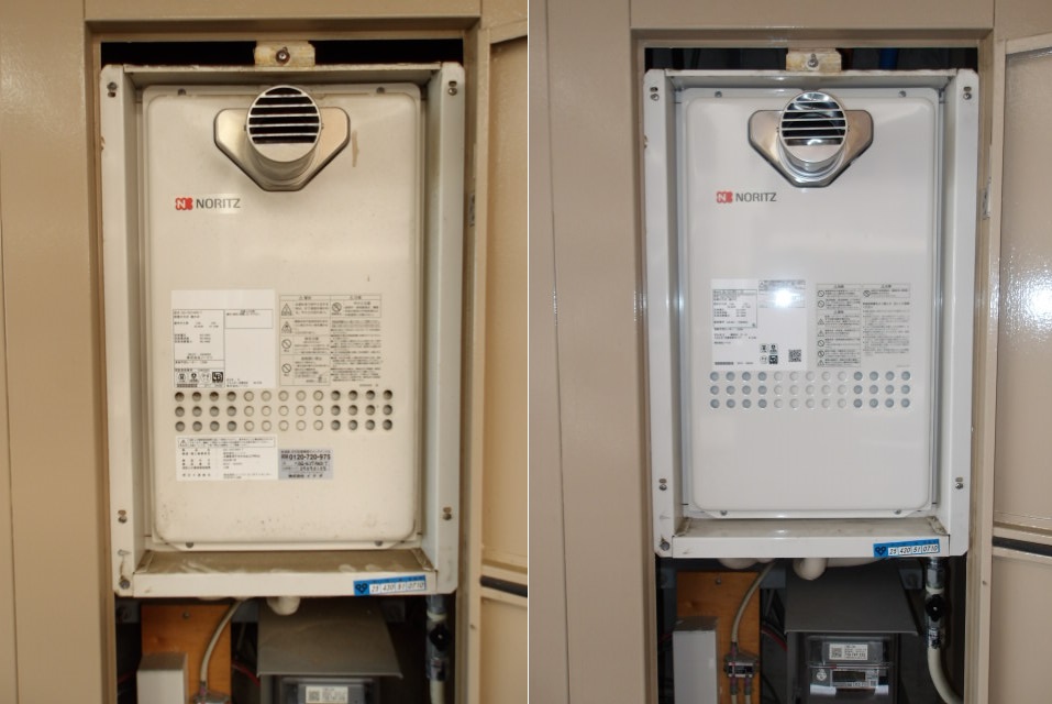 西宮市でガス給湯器の取替工事をさせていただきました。お客様より「お湯を出してもリモコンの燃焼ランプがついたり消えたりして使えませんので一度見てください」とご連絡をいただき訪問いたしました。