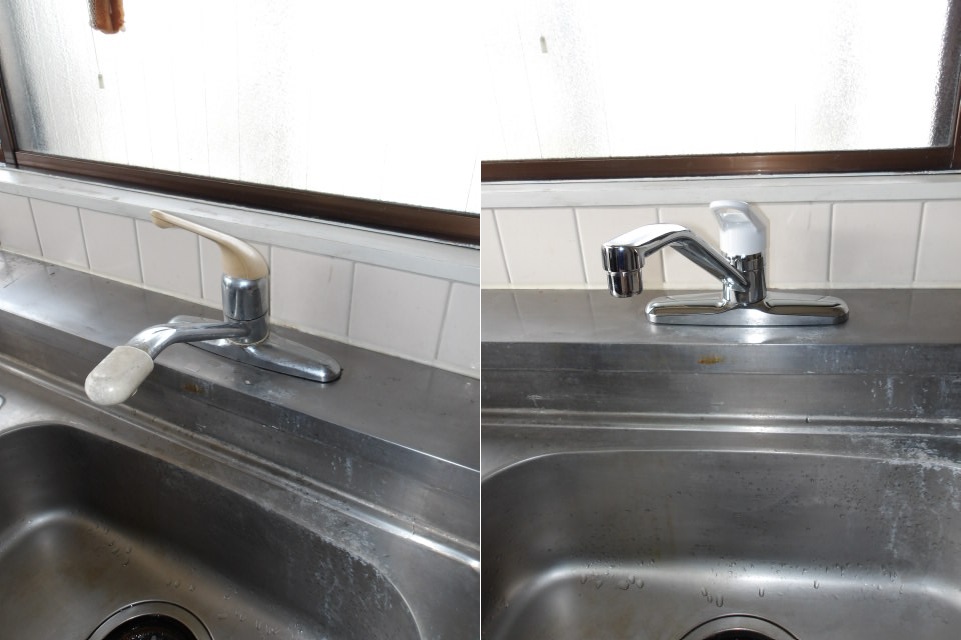 川西市でキッチン用水栓の取替工事をさせていただきました。賃貸マンションのオーナー様より「キッチン水栓を使用すると、根元から水がにじみ出てきます。確認したらかなり古い蛇口だったので交換をお願いします」とご依頼いただきました。