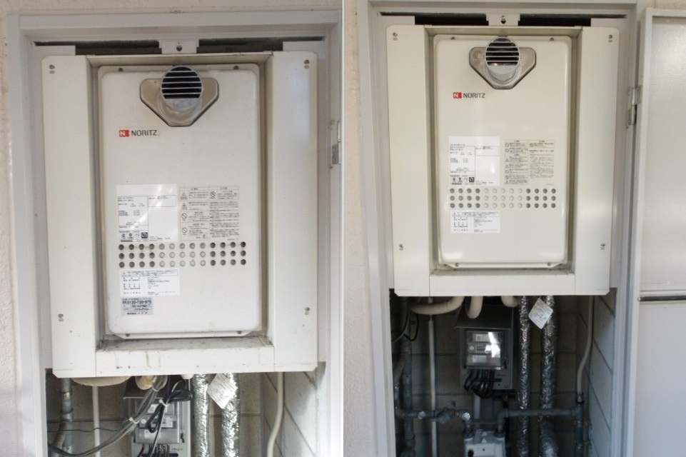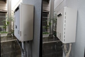機種はノーリツ製の16号高温水供給式ガス給湯器(PS設置形)への交換となりました。