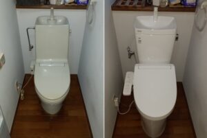既設トイレの確認をするとシャワートイレ一体型の製品でお客様のご希望は「シャワートイレの故障時に便座だけの交換ができるように、一体型ではなくシャワートイレと別々のトイレにしてほしい」との事でしたので今回アメージュタンク・便器と便座に分かれる製品での取替お見積もりをさせていただきご注文となりました。