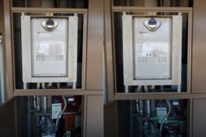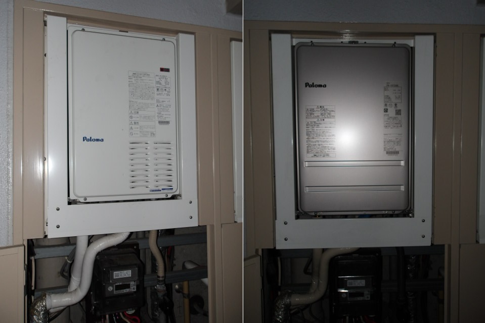 尼崎市の賃貸マンションで、後方排気形16号ガス給湯器のお取替でした。