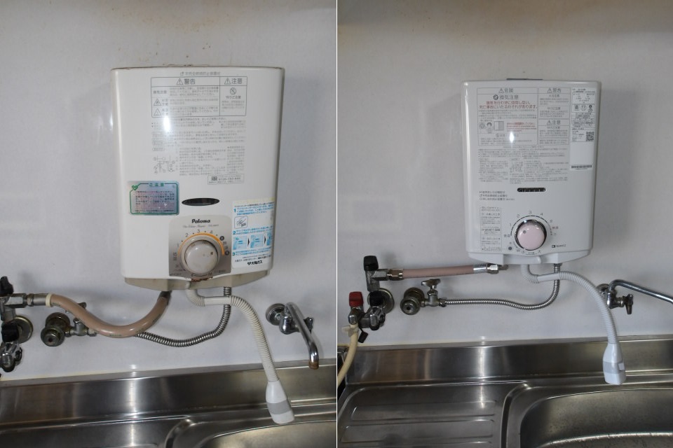 今回パロマ製の5号元止め式湯沸かし器でPH-509Bより、ノーリツ製のGQ-551MWへの交換となりました。