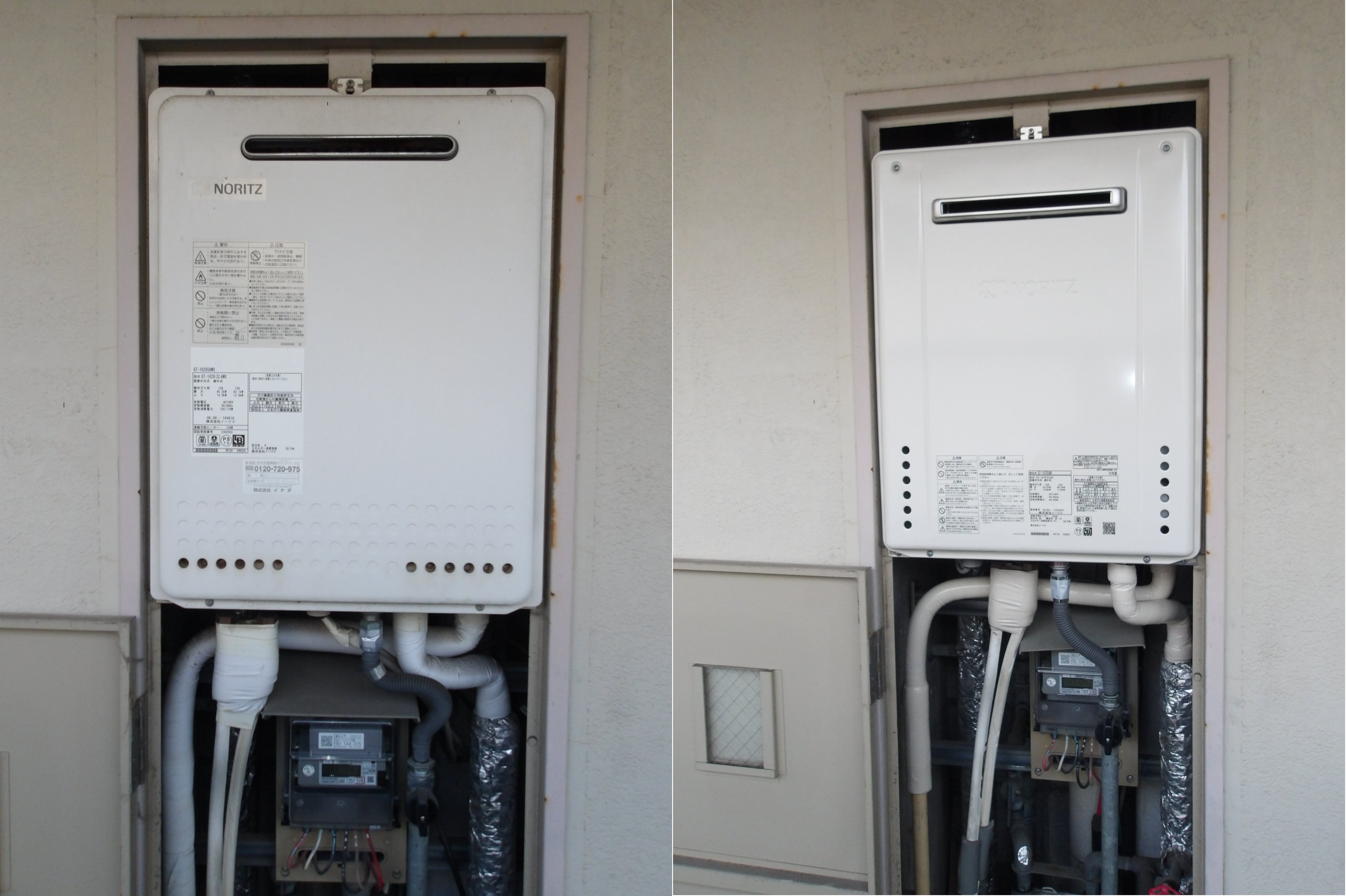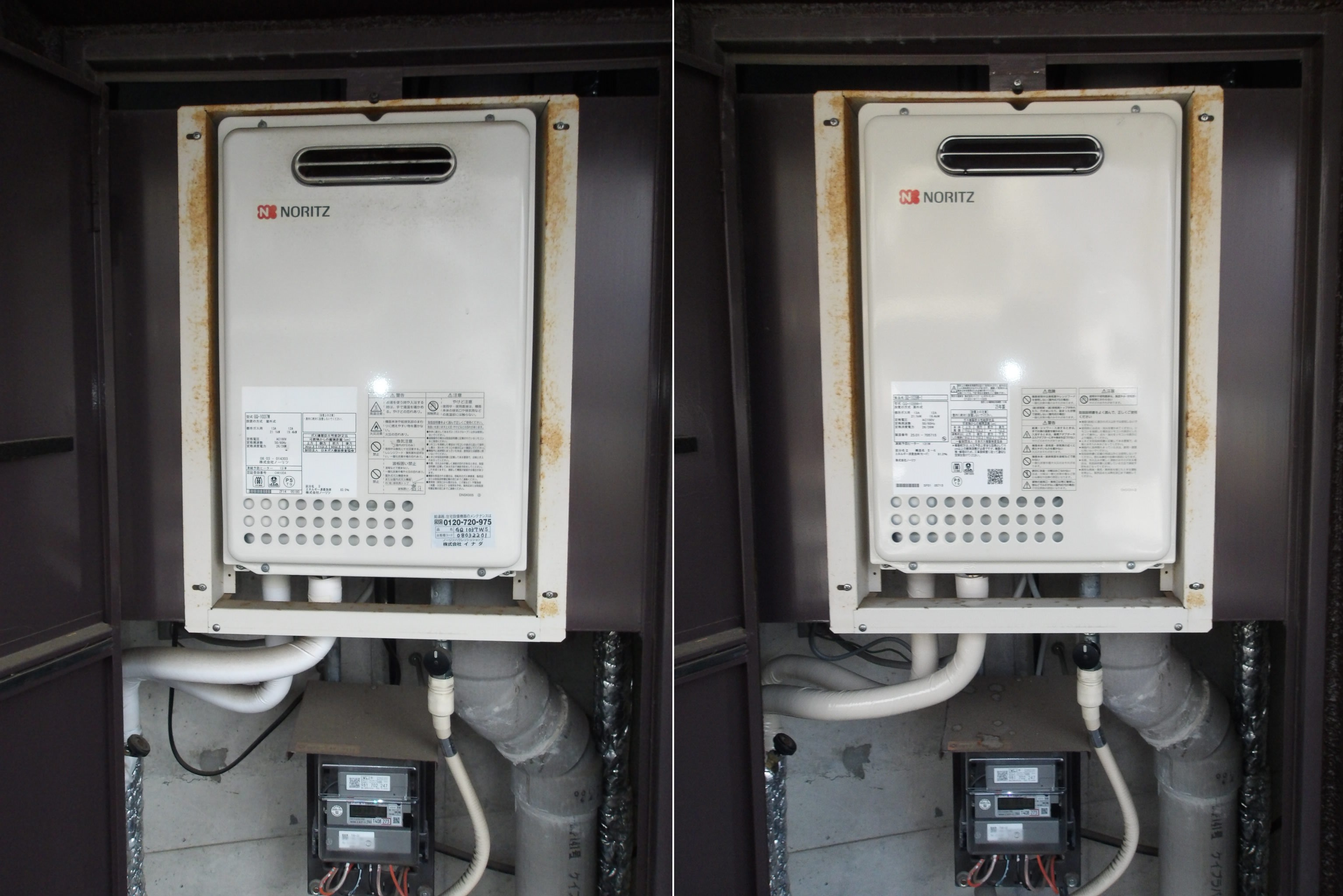 既設給湯器はご使用いただき約20年経過で寿命時期が来ており、補修用の部品も供給終了している機種となりますので、オーナー様へ新しい給湯器への取替をご案内させていただきました。