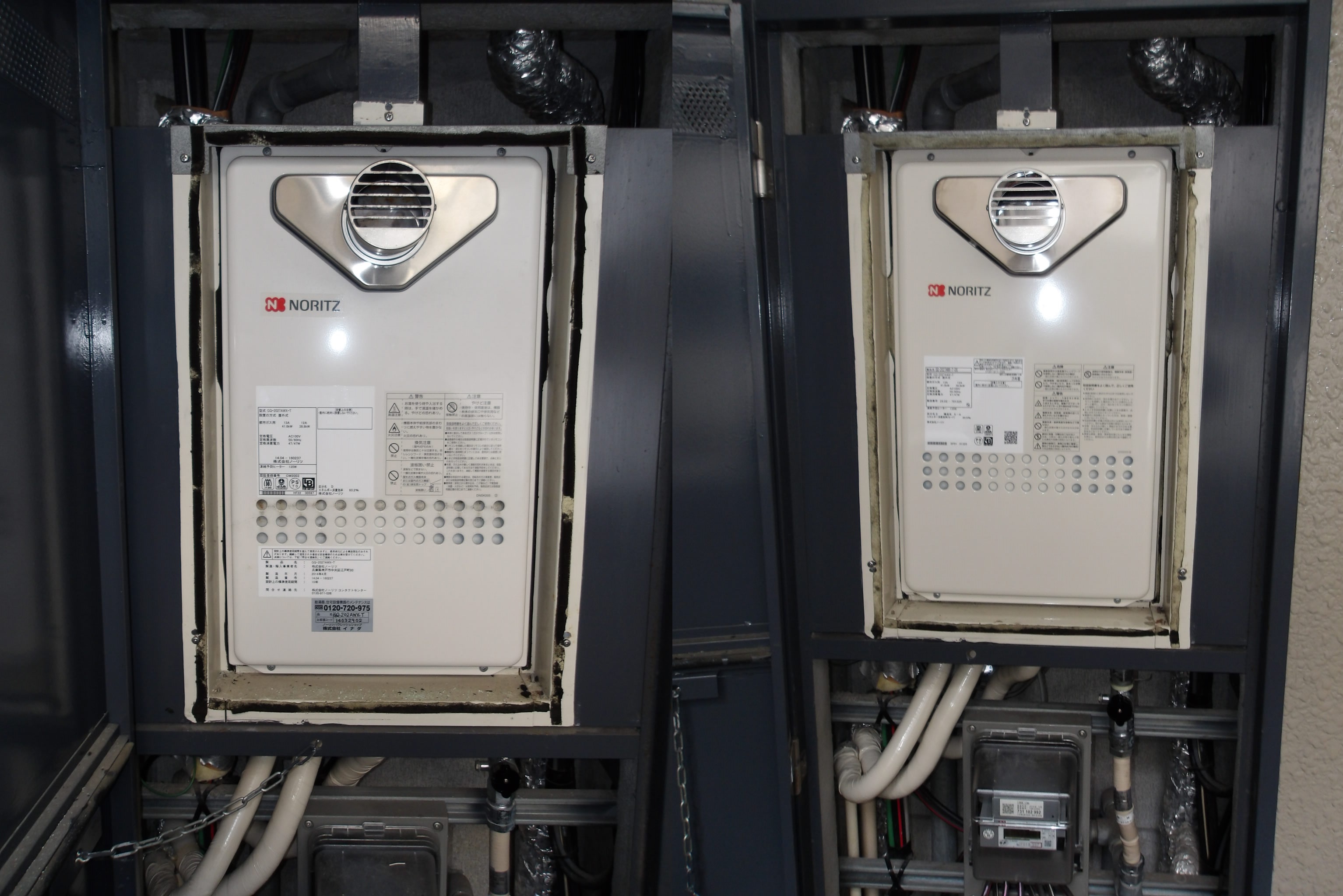 ノーリツ製16号給湯器のGQ-1637WSから、後継のGQ-1639WS-1の配管カバー仕様へ