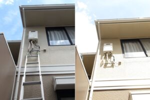 設置状況の確認に伺うと、取替する為には長いハシゴと安全のために2名での施工が必要です。調査には1人で伺っておりましたので一度倉庫へ戻って準備を整えて2名にて再度お伺いし、安全に注意しながら交換をさせていただきました。