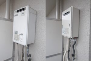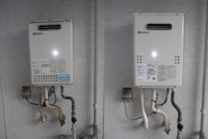 池田市の賃貸マンションで、ベランダ設置の給湯器を交換。
