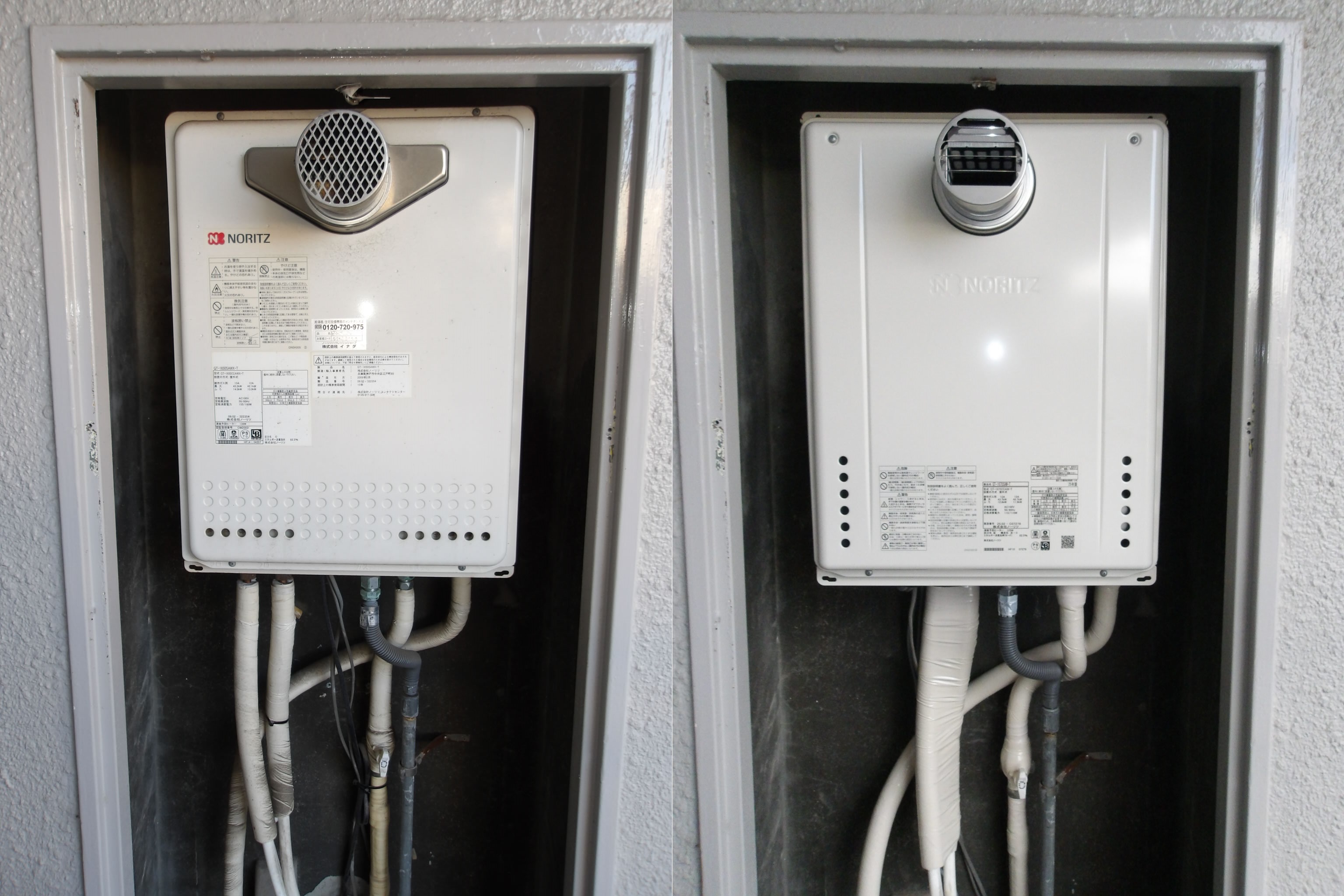 今回ノーリツの16号従来形ふろ給湯器のGT-1650SAWX-Tより、後継のGT-1670SAW-T(10年間修理保証付き)へのお取替となりました。