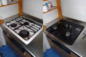 交換後お客様よりレンジフードは今までの物と比べ手入れが簡単になってよかった。コンロも天板やごとく周りの作りがシンプルなので掃除もしやすくなってよかったですとお喜びいただくことが出来ました。