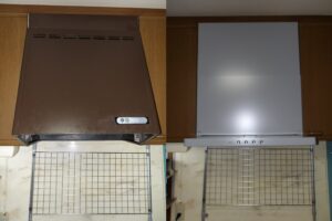 設置状況の確認に訪問してお客様のお話を伺うと「現在ブーツ型フードのプロペラファンですが、次は現在主流の薄型のシロッコファンでの取替が良いです」との事でしたので、今回お掃除、お手入れが簡単なスリム型ノンフィルターレンジフードでの取替見積もりをご案内させていただきました。