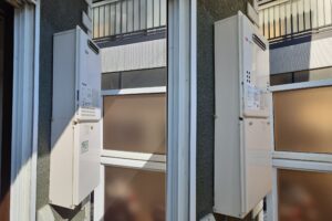 設置状況の確認に伺い見てみると、給湯器交換のためにハシゴを立てて作業する必要がありますが、敷地内に梯ハシゴを立てるスペースがない為、お客様へ隣地より梯子を立てさせていただき作業する必要があることを説明、お客様と一緒に隣地宅にごあいさつに伺い敷地内での作業のご了解をいただき後日取替工事無事完了いたしました。