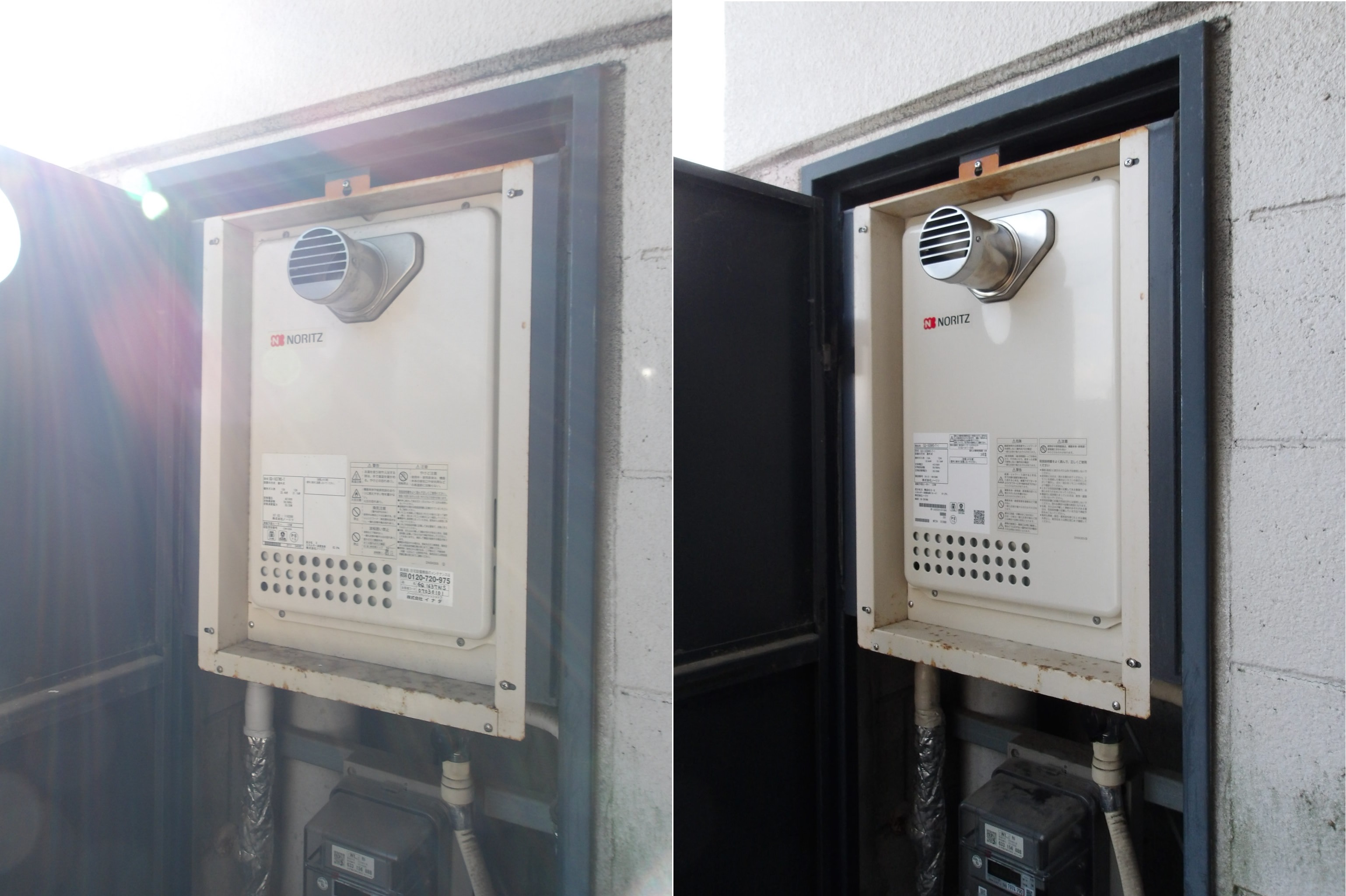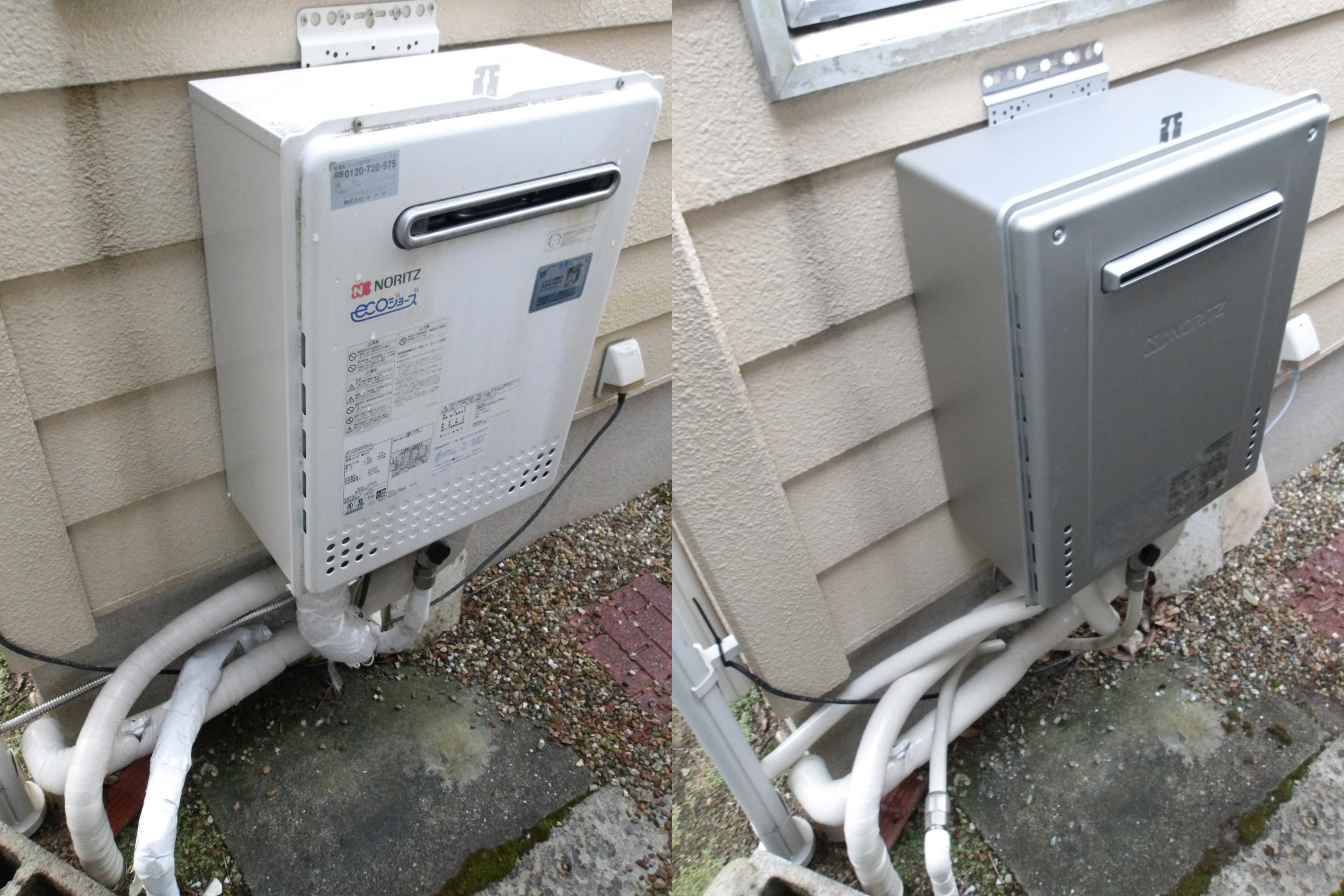 設置されている給湯器はノーリツのPS設置形の給湯器で、後継品の在庫は弊社にございましたので、当日の午後より取替工事をさせていただきました。