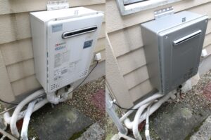 お客様へ故障原因、お修理費用の説明をさせていただきましたが、「前回設置してもらってから10年以上経過しているので、新しい給湯器に交換をしたい」との事でしたので今回同等品の後継機種での交換をさせていただきました。