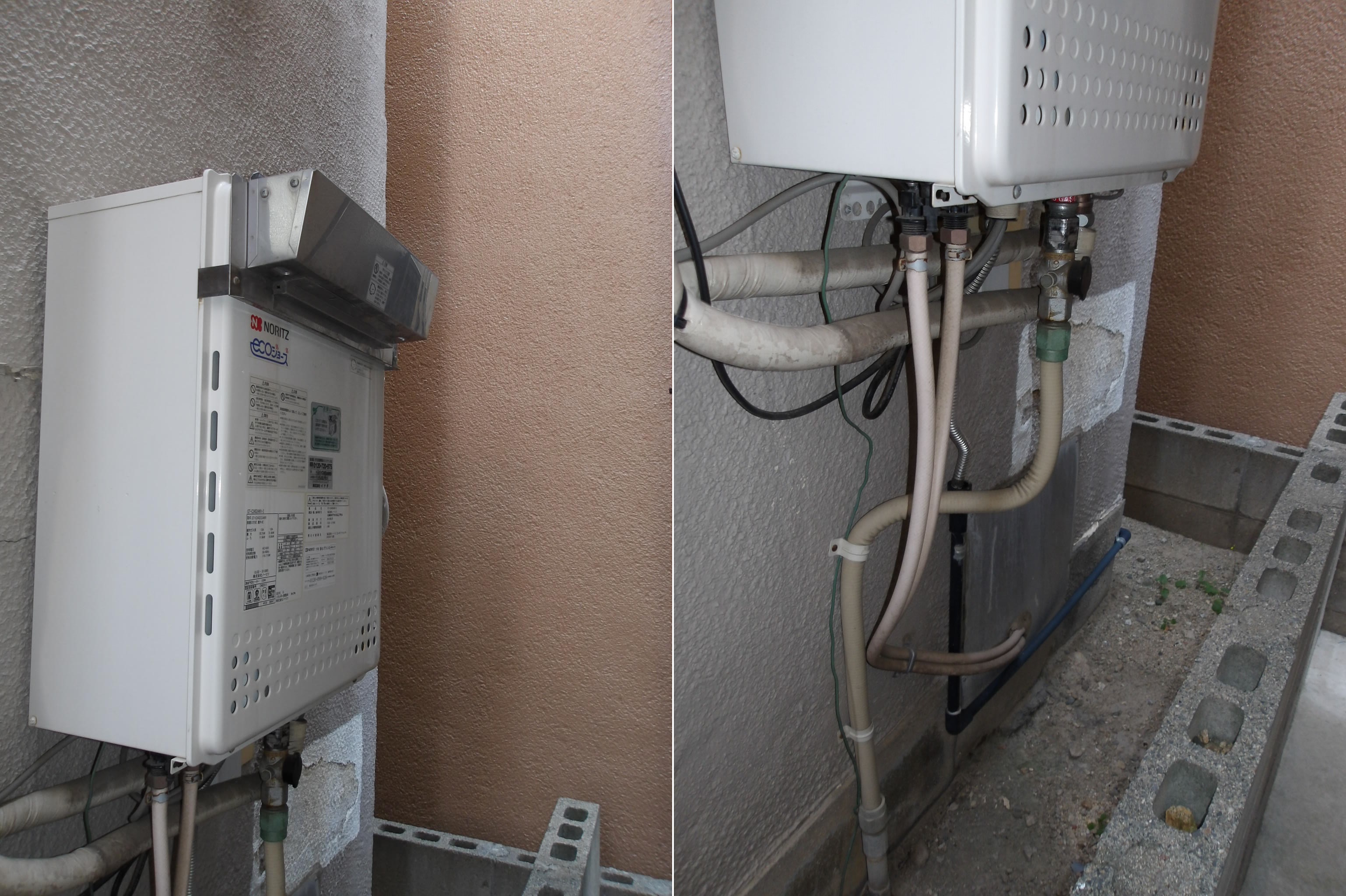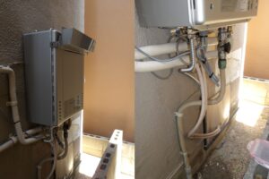 お伺いし点検させていただいたところ、「給湯器の寿命も10年ぐらいと聞いたことがあるので、やっぱり取替したいです」とご注文をいただきました。フルオートタイプの給湯器でしたが、オートタイプでも問題なく使えそうとのことで、オートタイプへの交換となりました。
