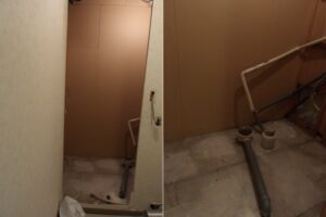現在設置されているユニットバスはTOTO製の1116サイズで、メーカー問わずの同等品でのお取替をご希望されました。今回LIXIL製の集合住宅用のユニットバスでの交換と脱衣場の内装貼替工事の見積もりを作成しご提案、ご注文をいただきました。