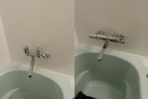お伺いしますとハーマン製で19年程使用されてる給湯器でした。浴室水栓もマンション入居時からそのままなので、水栓も一緒に交換お願いしますとご注文いただきました。ノーリツ製の同機能の給湯器とLIXILのサーモスタット付バス水栓のお見積りさせていただきご注文となりました。