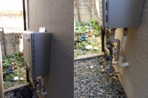 現調に伺い確認、既設給湯器はリンナイ製の給湯専用タイプで、今回どのメーカでの取替でもよいとの事でしたので、ノーリツ製の同等品でのお取替をさせていただきました。