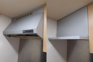 お伺いするとスイッチを押してもファンが全く動いていない状態でした。タカラスタンダード製で年数も20年近く経っているので、ファンのみの交換が出来ない状態でしたので、お客様に説明させていただき、お手入れの簡単なノーリツ製スリム型ノンフィルターレンジフードの交換をご提案をさせていただきました。