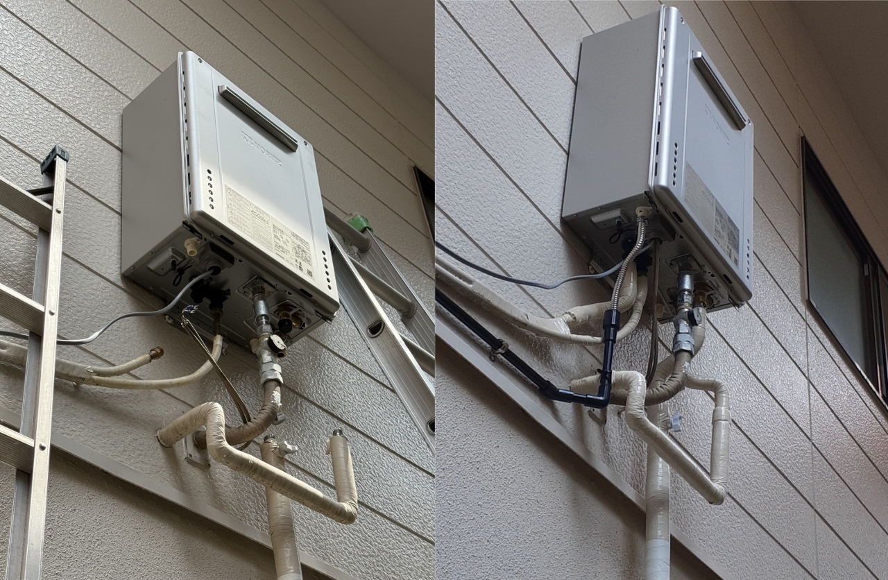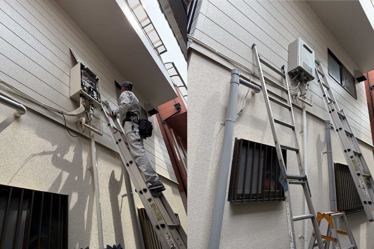 お伺いしますと浴室が2階にあり、給湯器も2階の壁に設置されていました。15年使用されてる給湯器で故障する前に交換しておきたいとの事でした。現在は従来型給湯器が設置されていましたが、今回は省エネ性能の高いエコジョーズをおすすめさせていただきご注文となりました。今回ハシゴに登りながらの作業になりましたので、スタッフを増員し安全に作業をすすめていき、無事に交換が完了しました。