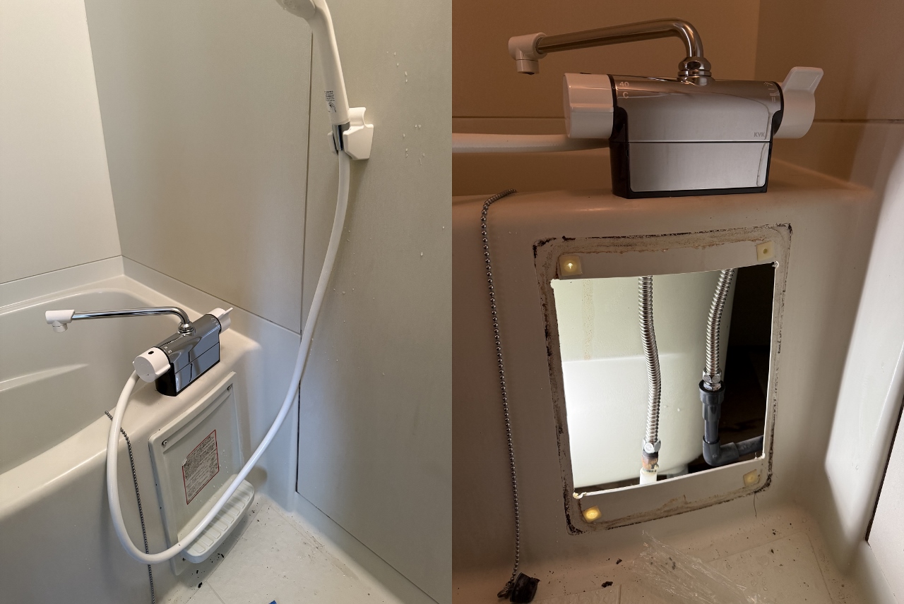 既設水栓は浴槽の上に設置されているデッキ形のシャワー水栓で、ご依頼元様より今回は温度調整のできるサーモ付きタイプでとの事でしたので、KVK製のデッキ形サーモ付きシャワー水栓での交換をさせていただきました。