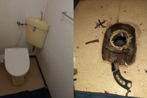 確認するとトイレタンク下の洗浄管が劣化し穴が開き水が漏れる状態でした。
