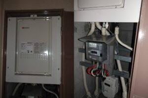 早速お伺いし、給湯器本体の点検をすると熱交換器より水が漏れており、漏電安全装置が作動し電源が入らない状態でした。給湯器も12年使用されていましたので、この機会に新しく交換しますとご注文をいただきました。