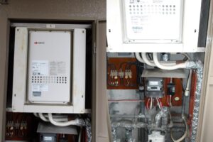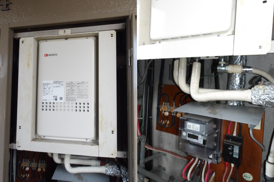 今回のご依頼はお客様より「マンションの廊下が水で濡れていたので確認したら給湯器本体の下の口から水がずっと出ています」とご連絡をいただきましたので点検に伺いました。