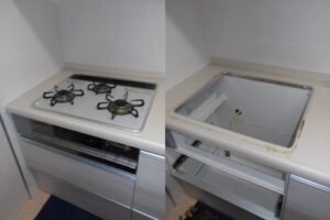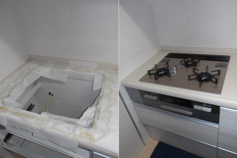 お客様より「ビルトインコンロで、右側の火が保持せずに消えてしまう。古いコンロなので交換見積もりをお願いします」とご連絡をいただきました。見積もりにお伺いしお客様のご希望を伺いましたら、今使用しているコンロと同等のガラストップでお願いしますとの事でしたので、今回ノーリツ製のミッケシリーズでお見積もりをさせていただき交換のご注文となりました。