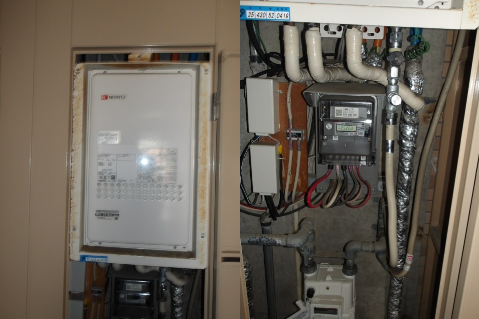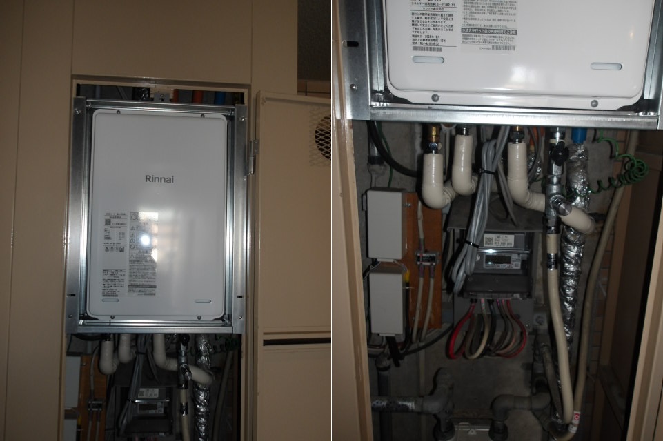 設置状況の確認するとマンションの廊下側のPS扉内設置の後方排気タイプの給湯器で、お客様よりリンナイ製の同等タイプの給湯器での取替をご希望されましたのでそちらの商品でお見積もりをさせていただきご提案、お取替となりました。