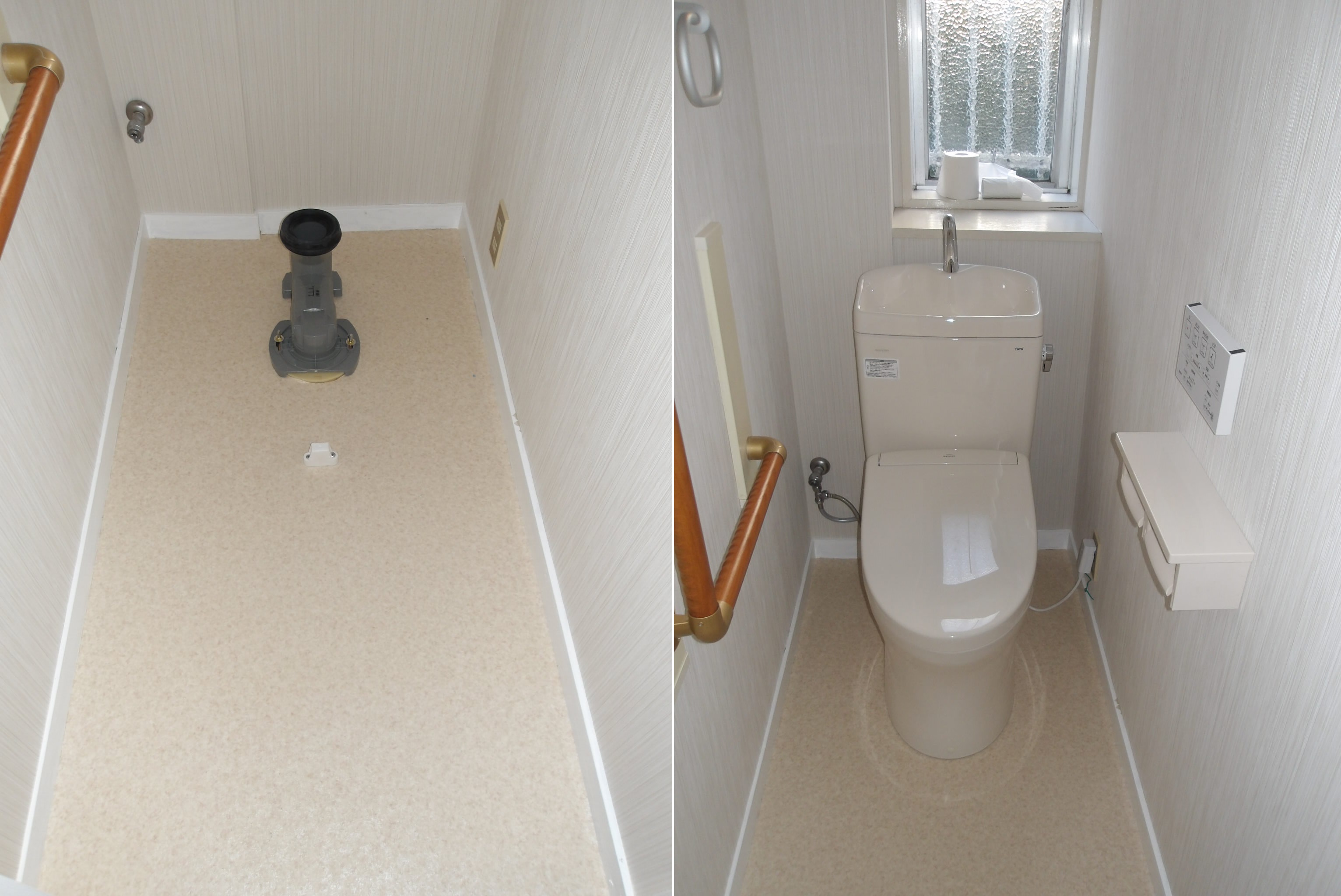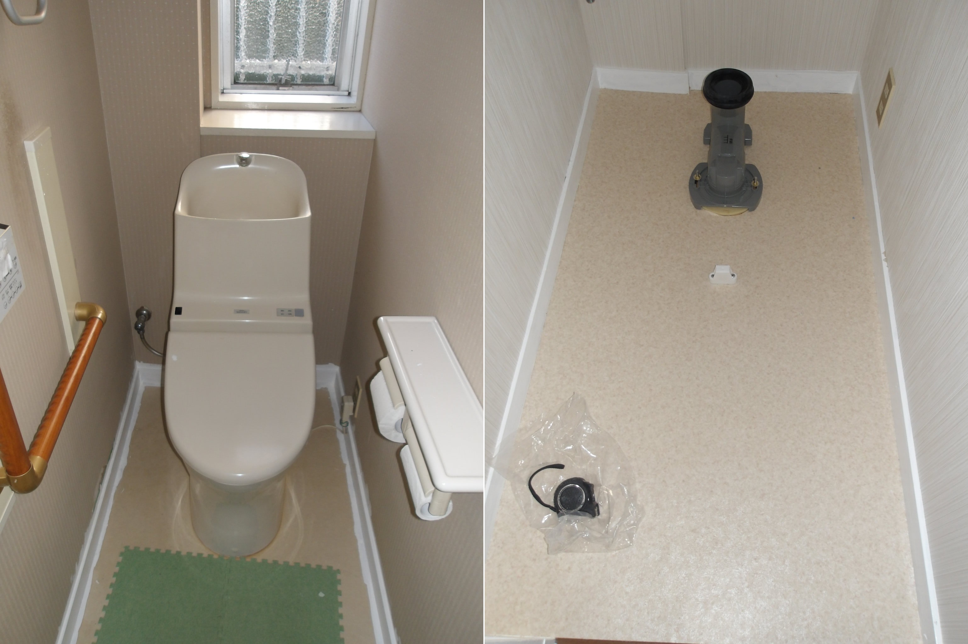 訪問しお話をお伺いいたしました所、今のトイレがウォシュレットとタンクトイレが一体式なので、それぞれ別々の構成のタイプのピュアレストQRでのお取替と、床のクッションフロアと壁紙の貼替をご希望されました。