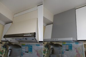 施工は既設レンジフードの取付面の壁の下地も劣化しガタガタでしたので、新たに木下地の工事を行い新しいレンジフードの設置をさせていただきました。