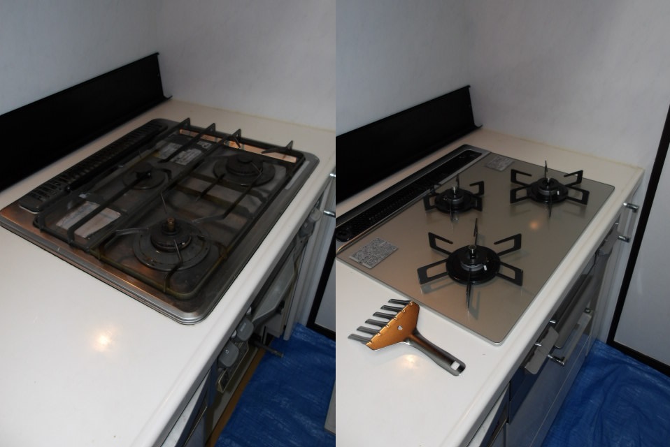 ガスコンロはパロマ製のメタルトップコンロのPKD-351HA-SVより、ノーリツ製ガラストップコンロのN3WV6RWTP2SIへ。