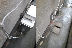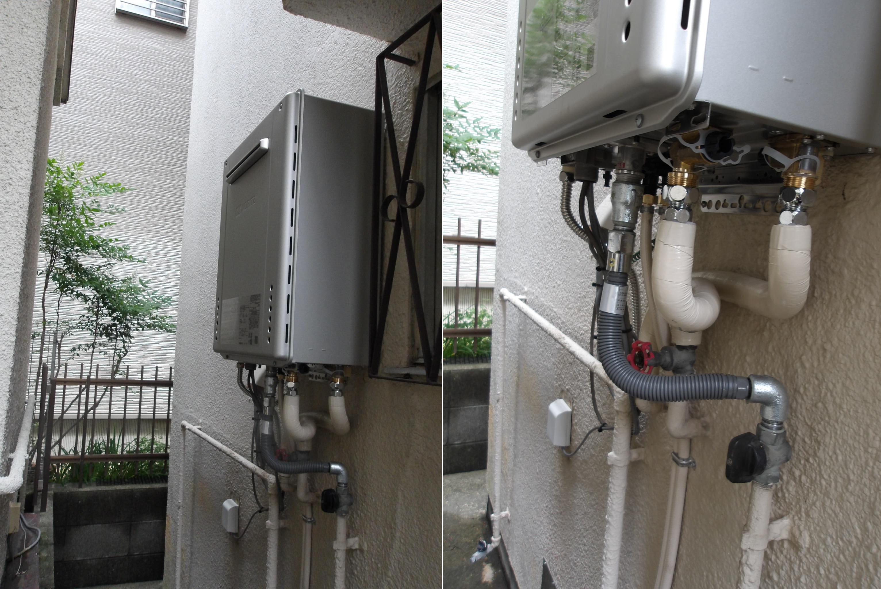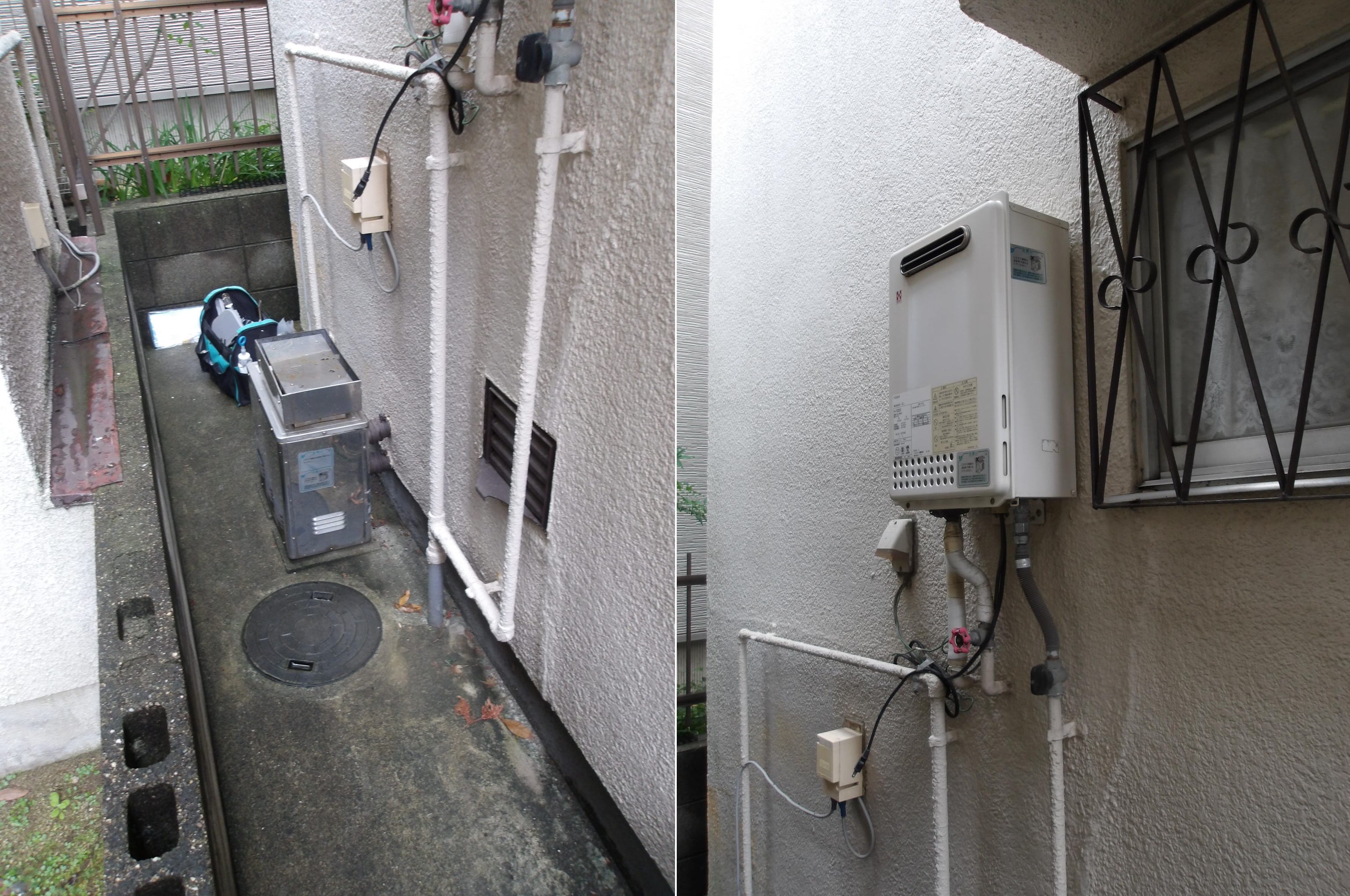 お客様が状況を隣で確認され「15年以上使用している釜ですので交換したいですが、どうせなら給湯器とふろがまが1台にまとまったエコジョーズに交換したいです」との事で今回ふろがまと20号給湯器を撤去し、新たにエコジョーズふろ給湯器を取付させていただきました
