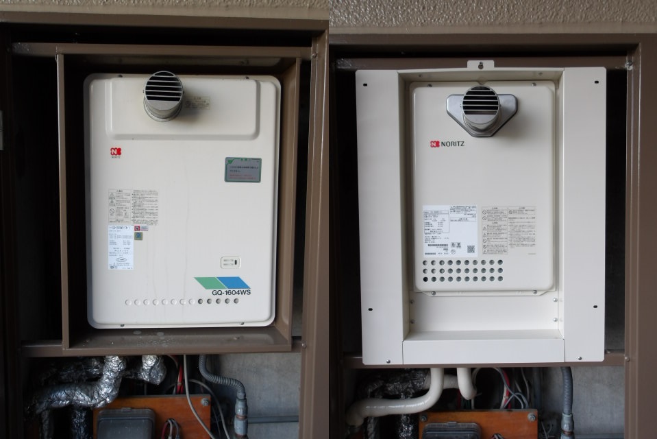 機種はノーリツ製のPS設置形の16号給湯器のGQ-1604WS-TAより、GQ-1639WS-T-1への交換となりました。
