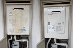 ご使用の給湯器は27年以上経過しておりましたので、給湯器の寿命説明と、新しい給湯器へのお取替の提案をさせていただき交換となりました。