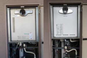 設置されている給湯器はリンナイ製のPS扉内設置形の16号ふろ給湯器で、今回同メーカーの同等の後継機種でのお見積もりを作成しご案内、取替のご注文をいただきました。