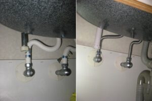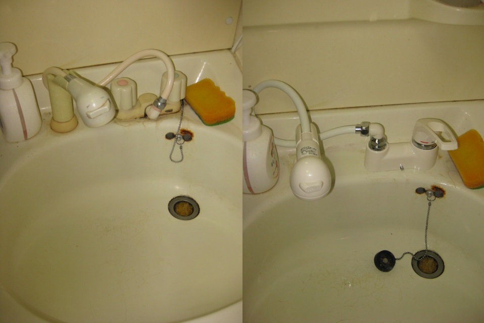 箕面市の賃貸ハイツで、洗面用洗髪シャワー水栓の取替工事です。