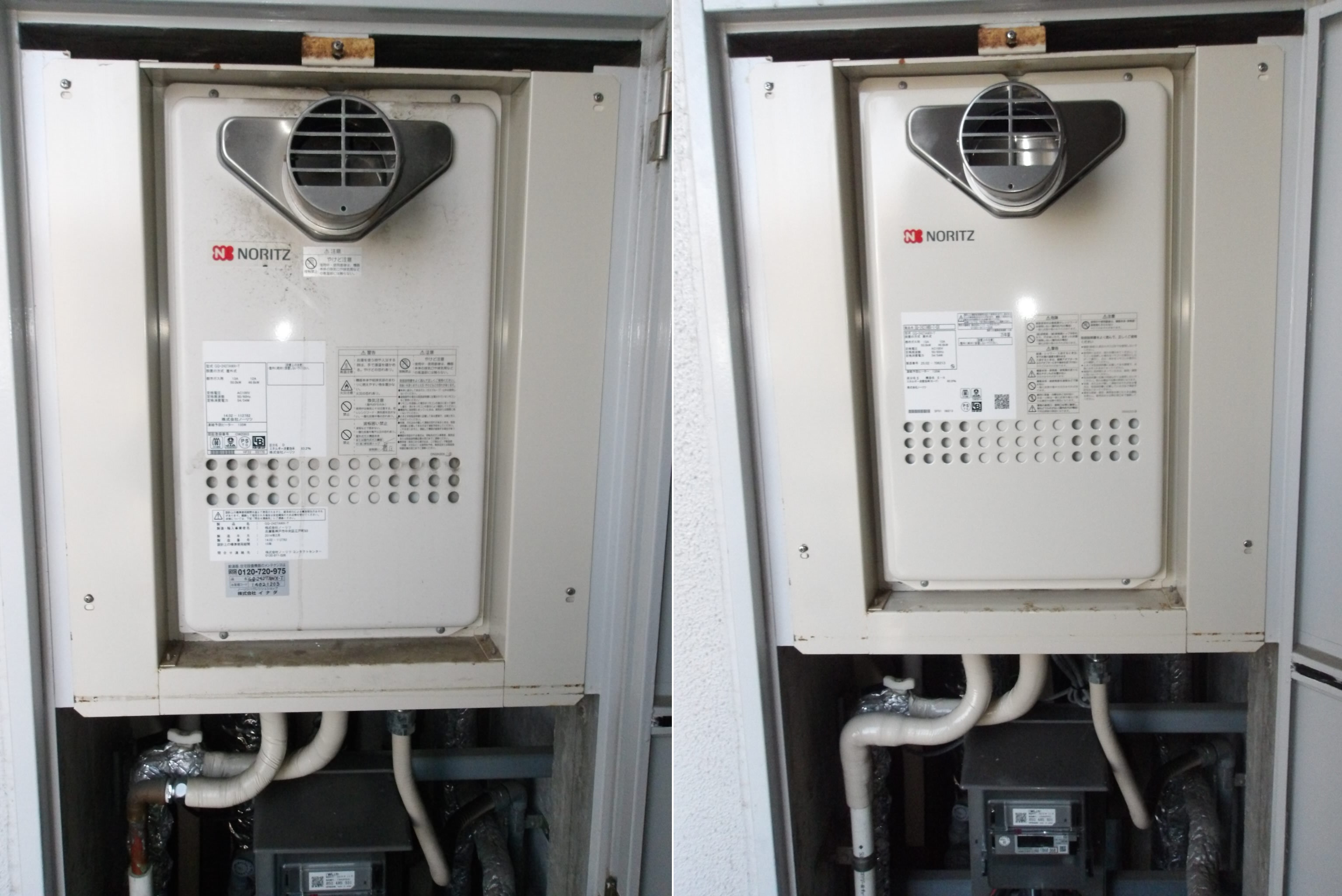 今回はノーリツ製の24号高温水供給式給湯器でGQ-2427AWX-T-DXの10年修理保証付きへの取替となりました。