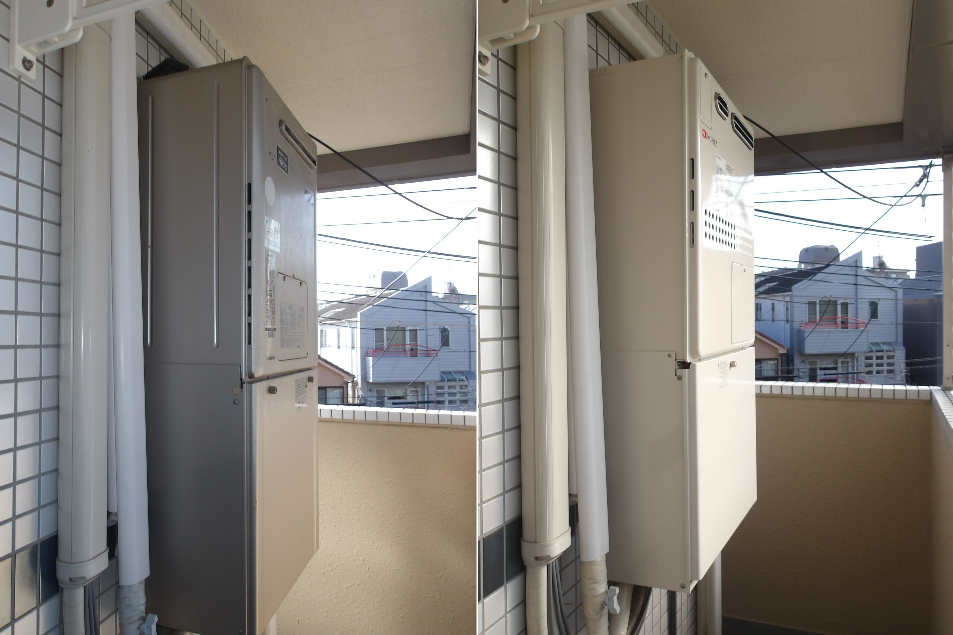設置状況を確認に行きますと、リンナイ製の24号ガス温水暖房付給湯器(エコジョーズ)が設置されておりました。同等品でお願いしますとのことでしたが、今回は非エコで大丈夫ですとの事でしたので、ノーリツ製の24号ガス温水暖房付給湯器と浴室暖房乾燥機(ミスト付)でお見積りさせていただき交換となりました。