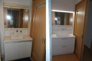 施工後お客様より「3面鏡のLED照明も明るくて、真白の洗面化粧台ともマッチしてよかったです」とお喜びいただけました。